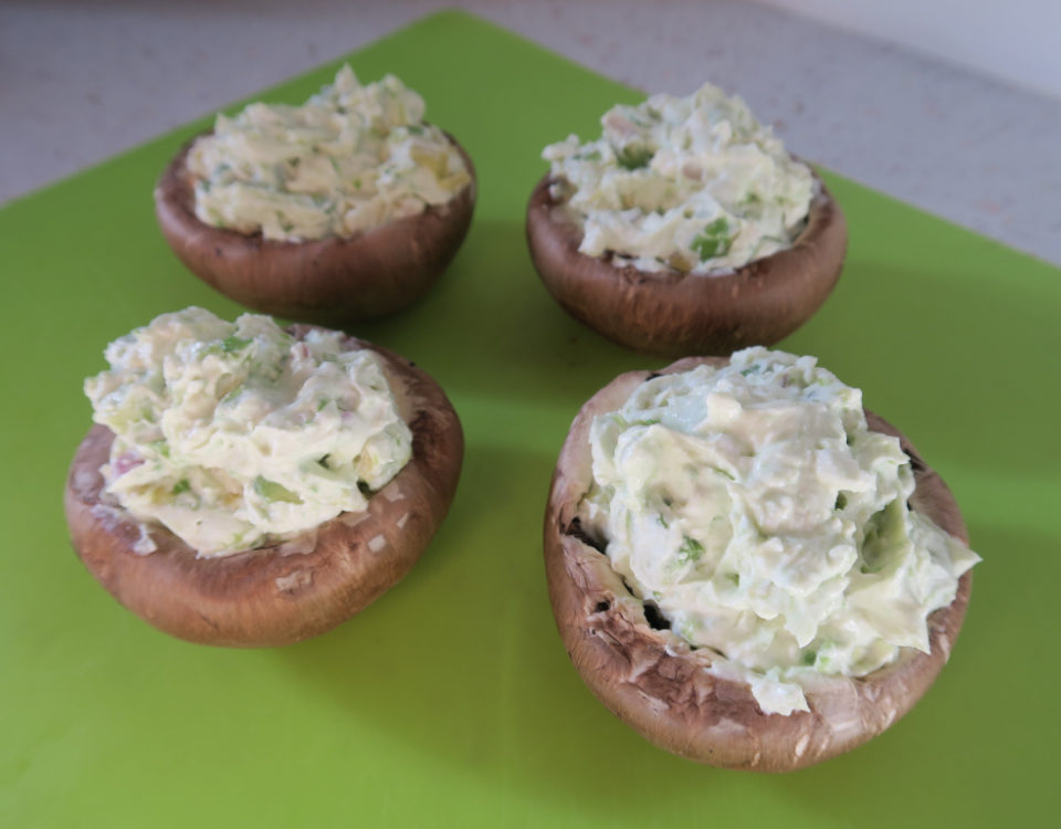 - Dans un plat creux mélanger le tout et garnissez vos têtes de champignons avec votre mélange
