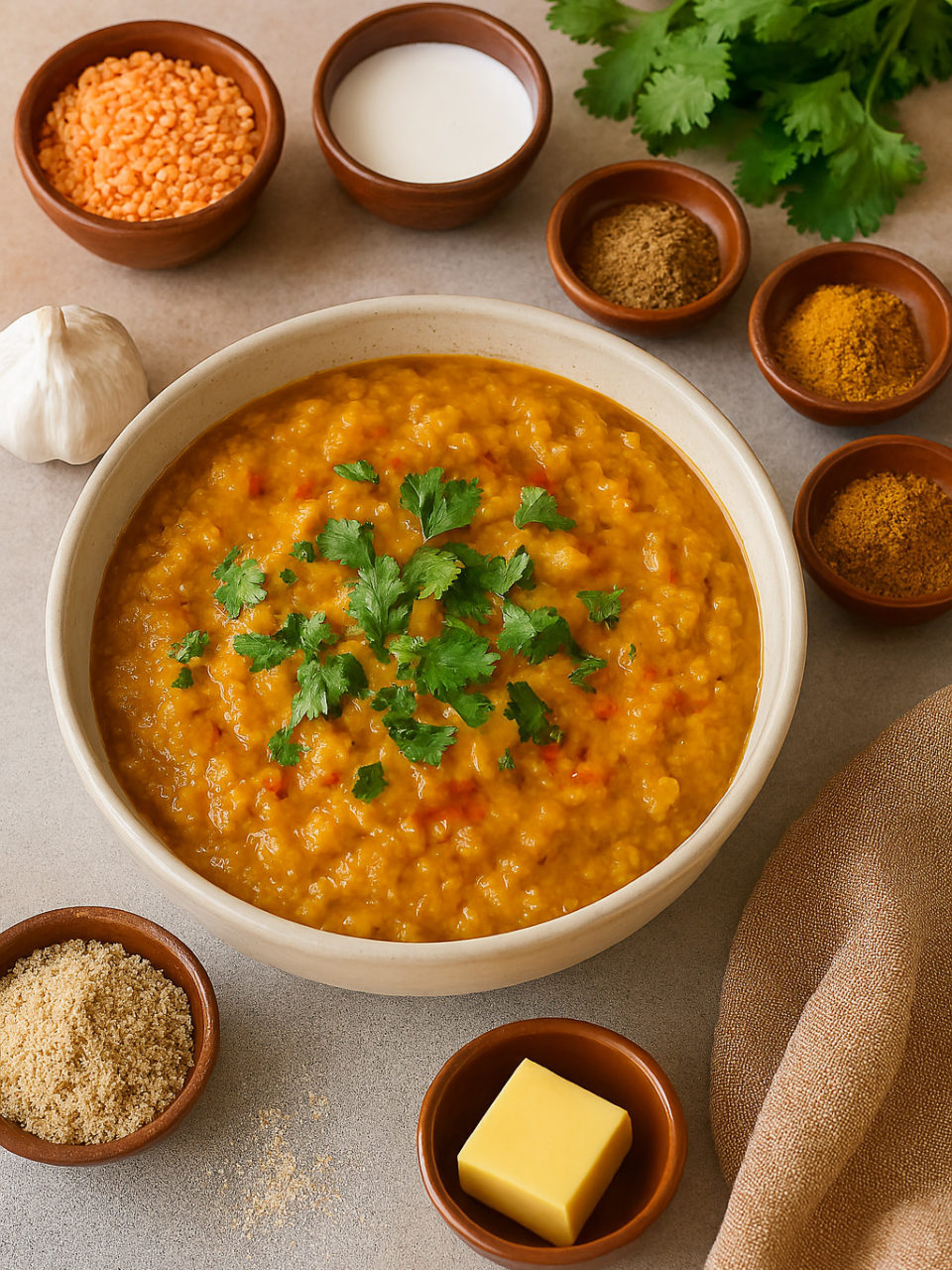 Ce dahl de lentilles corail est une invitation au voyage. Entre les épices douces, la chaleur du lait de coco et la fraîcheur de la coriandre, chaque cuillerée est un concentré de réconfort. À servir seul, avec du riz ou du pain naan, selon l’envie du moment.
