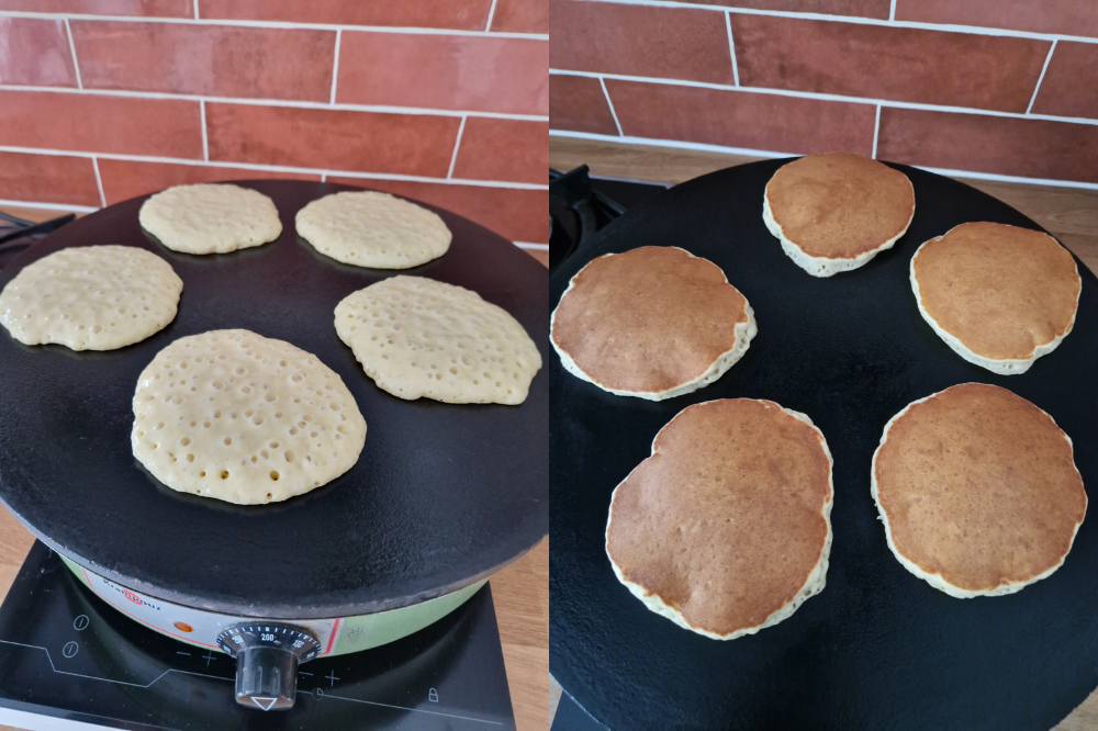 - Cuire de petites louches de votre pâte sur une poêle antiadhésive légèrement huilée ou sur un billig si vous avez la chance d’en avoir un. (Pour la chauffe du billig le régler sur 180°).