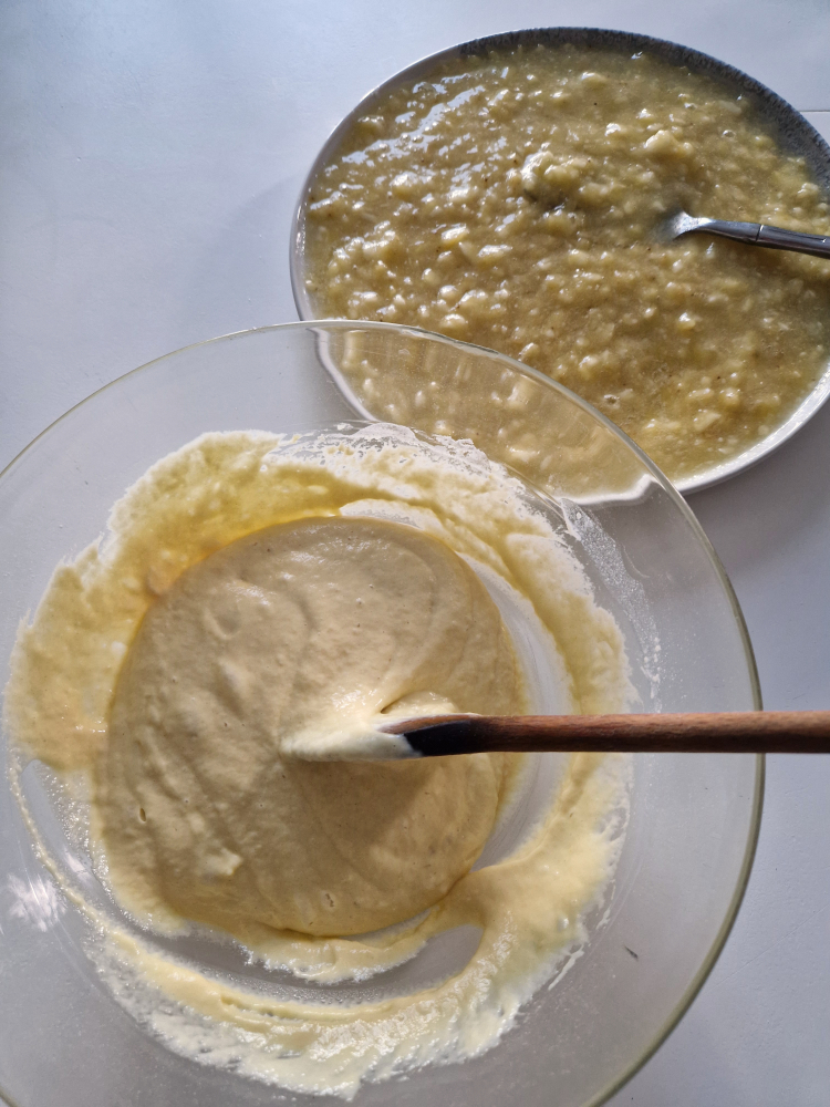 - Quand la pate est homogène, ajouter vos bananes écrasées au sucre.